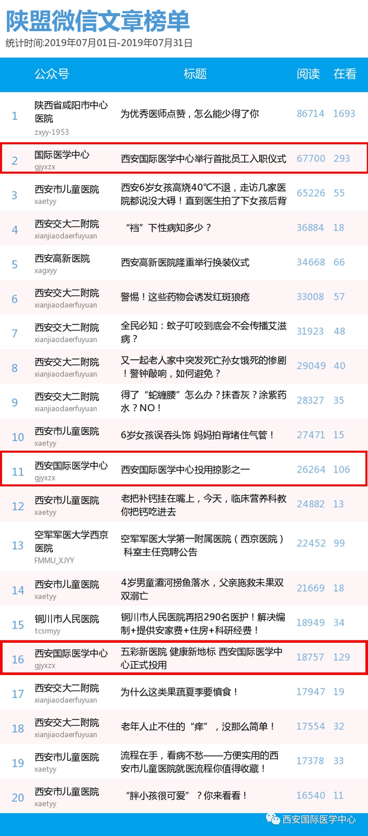 8月2日,中國醫(yī)療自媒體聯(lián)盟陜西分盟醫(yī)療機構(gòu)類微信公眾號7月份排行榜發(fā)布,西安國際醫(yī)學(xué)中心微信公眾號奪得醫(yī)療機構(gòu)類榜單第2名,高居“榜眼”。在陜西醫(yī)療自媒體聯(lián)盟的推薦下,西安國際醫(yī)學(xué)中心順利進入今日頭條號(醫(yī)療機構(gòu)),微信文章將同步刊登到今日頭條。