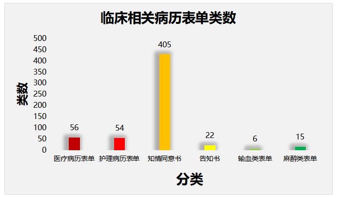 根據(jù)JCI第六版評(píng)審標(biāo)準(zhǔn),完成JCI相關(guān)醫(yī)療病歷表單類56類,JCI相關(guān)護(hù)理病歷表單54類、知情同意書405類、告知書22類、輸血類表單6類、麻醉類表單15類,總計(jì)583類。如圖所示: