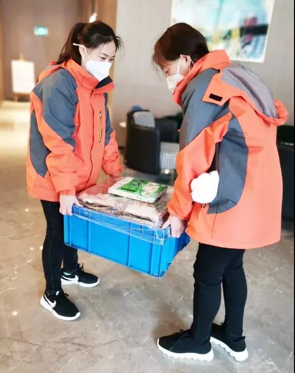統(tǒng)一分發(fā),把飯菜送到每個(gè)房間。為了避免人員密集,駐地各樓層負(fù)責(zé)人會將飯菜從一樓集中運(yùn)送至各樓層并分發(fā)到每個(gè)人房間門口的床頭柜上。并及時(shí)通知大家食用。但由于駐地工作任務(wù)多,節(jié)奏快,很多隊(duì)員不能及時(shí)就餐,細(xì)心的姑娘們會定時(shí)檢查取餐情況,及時(shí)為隊(duì)員熱上可口的飯菜。用餐后半個(gè)小時(shí)后,她們又及時(shí)將垃圾進(jìn)行整理運(yùn)輸?shù)骄频觊T口右邊的垃圾暫存點(diǎn)。