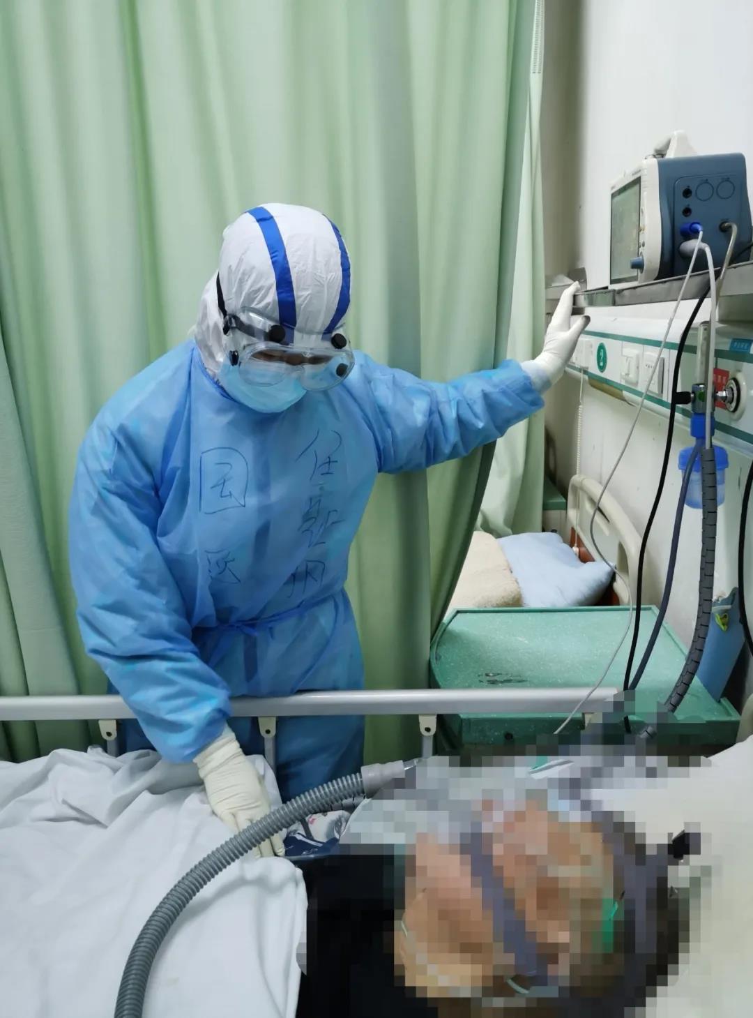凌晨1點(diǎn)多,一位84歲的老人,確診為陽(yáng)性,無(wú)尿,四肢冰冷,使用呼吸機(jī)。我們迅速補(bǔ)液,并用手套自制的暖水袋給予保暖,同時(shí)不停地喊著:“爺爺,爺爺,不能放棄,加油,我們陪在你的身邊,一起和病毒做斗爭(zhēng)!”他好像能聽(tīng)得見(jiàn)我們說(shuō)話,微微地動(dòng)了一下頭,眼角濕潤(rùn)了。