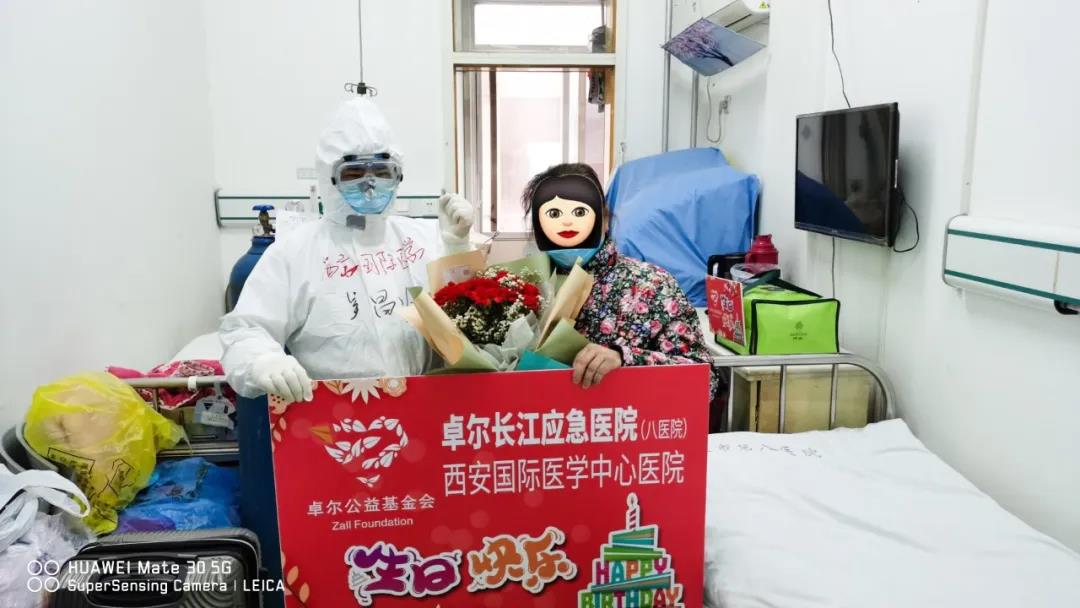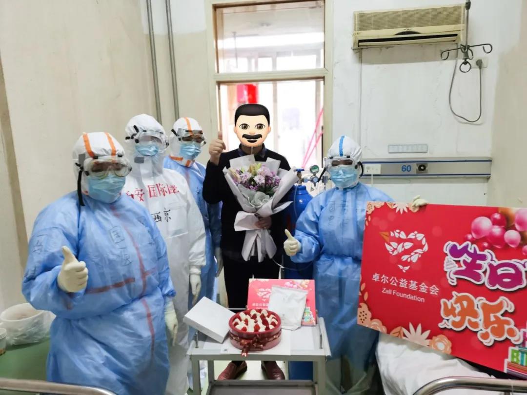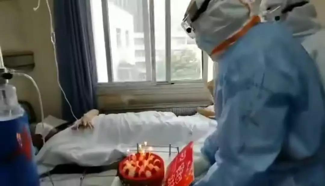 在第八醫(yī)院的病房里,醫(yī)護人員特地為過生日的患者準(zhǔn)備了鮮花、生日蛋糕等禮品。在醫(yī)護人員的精心準(zhǔn)備下,大家為患者送上了西安的特產(chǎn):蘋果,唱起了生日歌。溫馨悠揚的歌聲回蕩在病房里。每一個人不由自主拍起手,輕聲和著。歌聲末了,熱烈的掌聲響起來,“武漢加油!”“中國加油!”此起彼伏的歡呼聲響起來。