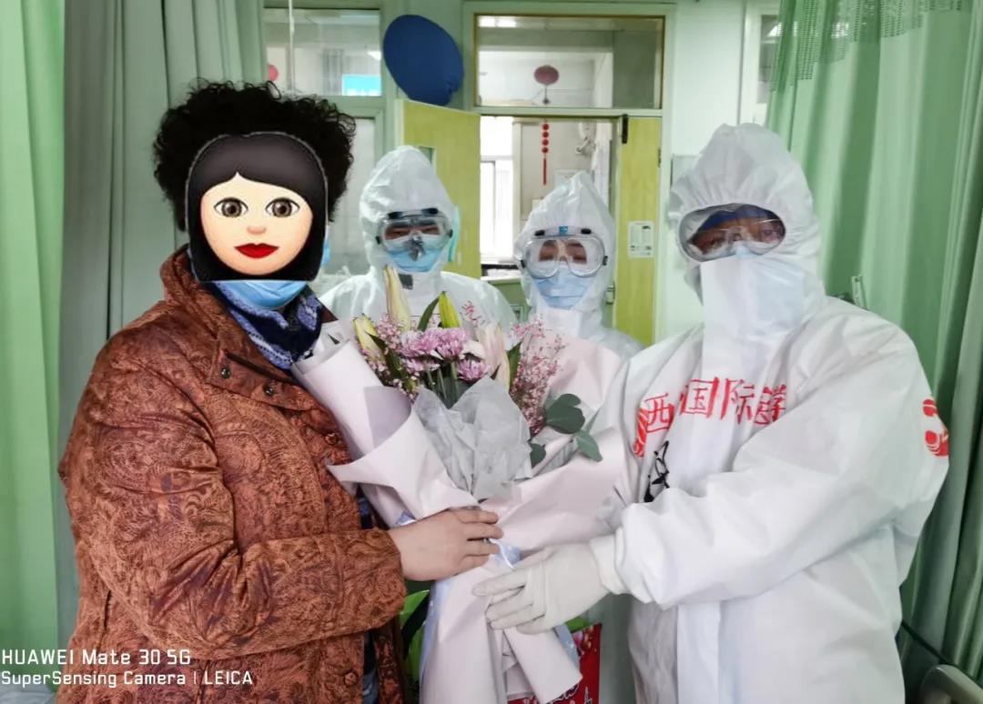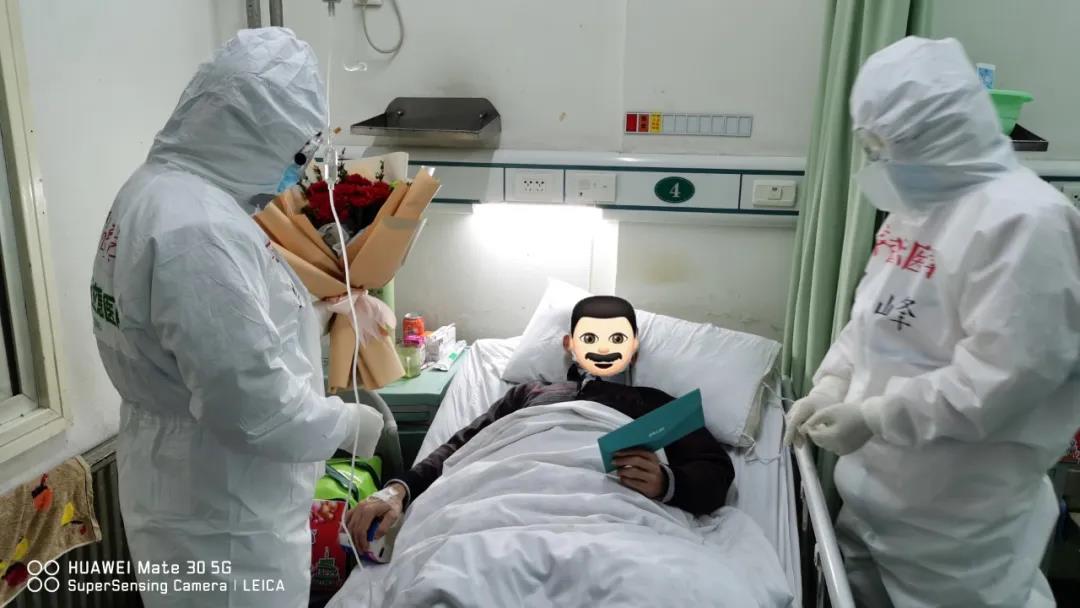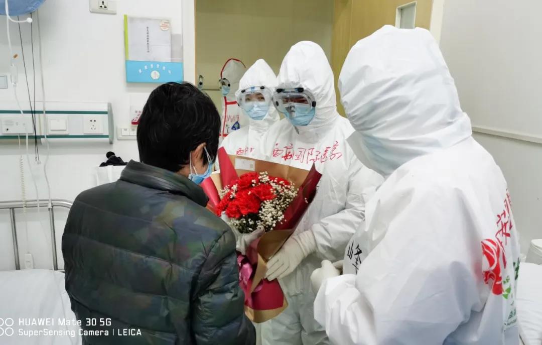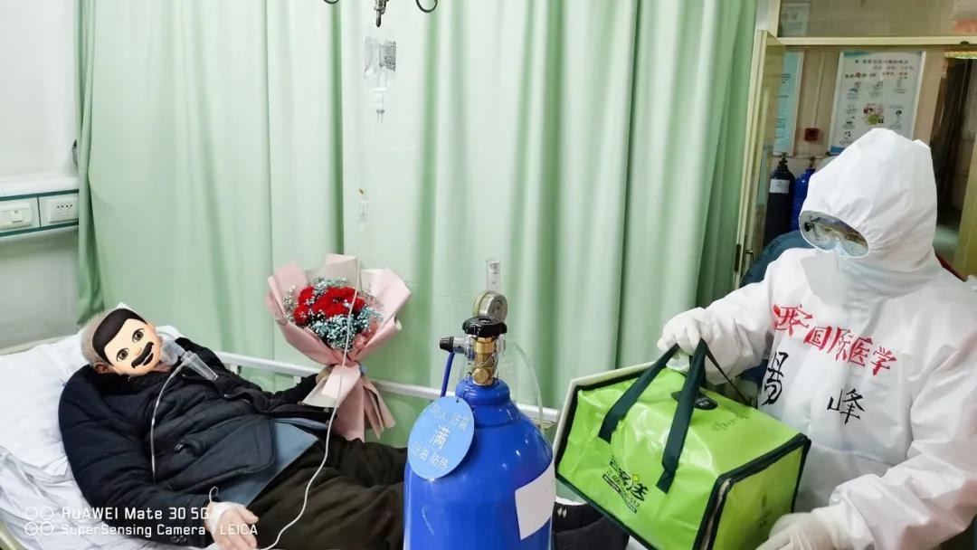 醫(yī)護人員為59歲患者袁某某送上鮮花