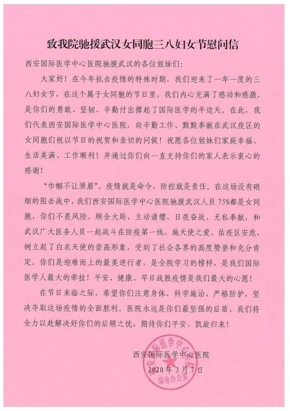 “疫”線有我,做“逆行先鋒”。疫情發(fā)生正值春節(jié)假期,西安國際醫(yī)學(xué)中心醫(yī)院從全面部署防控工作到建立聯(lián)防聯(lián)控工作機(jī)制,從醫(yī)療隊員火速馳援到醫(yī)療物資緊急保障,從正式進(jìn)駐武漢第八醫(yī)院和隨州市中心醫(yī)院到全面接收新冠患者……都有女隊員們不懼危險、日夜奮戰(zhàn),同時間賽跑,與病魔較量的身影。2月2日,接陜西省衛(wèi)健委馳援武漢的指令,5個小時,1000余名女醫(yī)護(hù)人員主動請纓,遞交了請戰(zhàn)書、紅手印。腫瘤醫(yī)院副院長薛妍教授、感控部主任劉冰、總護(hù)士長倪曉慧等醫(yī)護(hù)人員舍小家、為大家,迅速出擊、臨危不懼,不計名利、不顧生死,于2月3日搭乘包機(jī)到達(dá)指定地點,令人肅然起敬,令人敬佩感動。