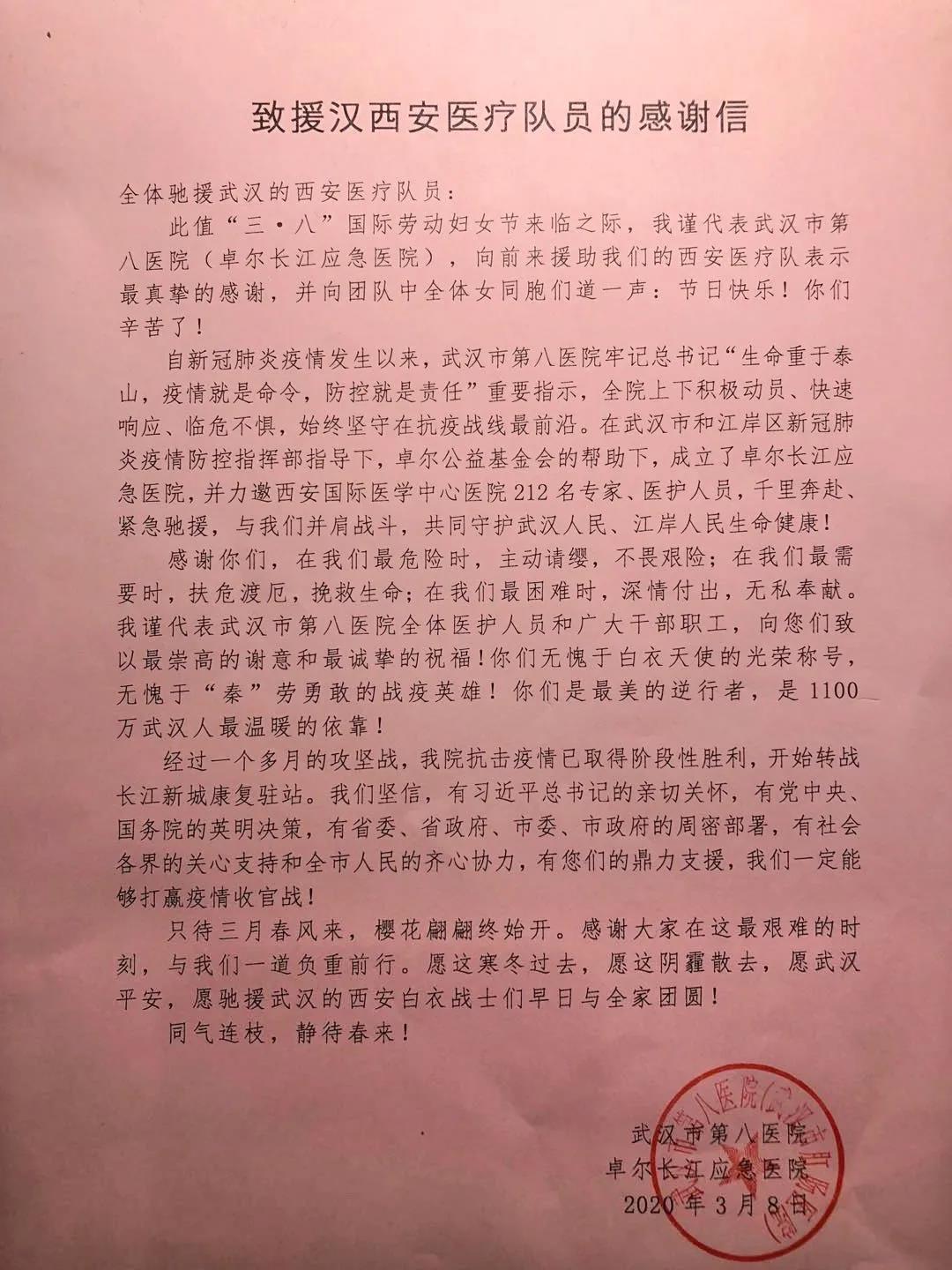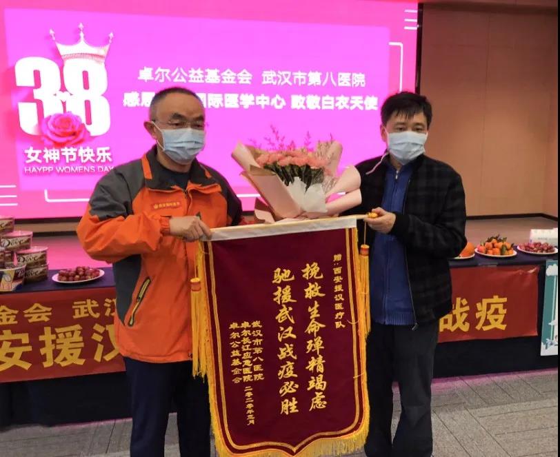 3月8日國際勞動婦女節(jié),武漢市江岸區(qū)副區(qū)長蔣志耕,江岸區(qū)衛(wèi)健局黨委書記、局長童衛(wèi)橋,武漢市第八醫(yī)院黨委書記唐迎春,卓爾公益基金會副理事長方黎等領導前往西安國際醫(yī)學中心醫(yī)院赴湖北醫(yī)療隊駐地,為“抗疫女神”們送上節(jié)日祝福。醫(yī)療隊隊長楊峰、黨支部書記李斌、專家組成員及隊員代表等出席。會議由江岸區(qū)衛(wèi)健局童衛(wèi)橋書記局長主持。