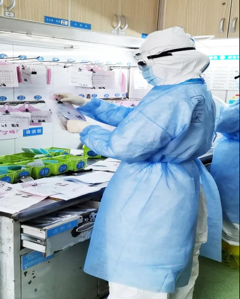 一線臨床的治療和護(hù)理工作,是真正考驗(yàn)技術(shù)的環(huán)節(jié)。加藥配藥嚴(yán)格無菌操作、雙人核對(duì)。戴著多層防護(hù)手套工作,一雙“大手”小心翼翼拿取每一小支安瓿抽吸藥液時(shí)稍顯笨拙,但是護(hù)士說:“現(xiàn)在加藥的姿勢可能有點(diǎn)狼狽,但是我沒有浪費(fèi)一滴藥,這都是在科室練出來的基本功?!?/span>