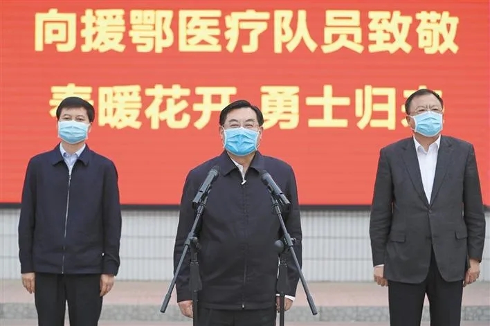 胡和平代表省委、省政府和全省人民,歡迎白衣戰(zhàn)士們平安凱旋,向仍然堅(jiān)守在湖北的醫(yī)療隊(duì)員表示誠摯慰問,向醫(yī)務(wù)人員家屬的理解和支持表示衷心感謝。胡和平指出,習(xí)近平總書記十分關(guān)心關(guān)愛一線醫(yī)務(wù)人員,黨中央、國務(wù)院作出了一系列安排。希望大家在接下來的這段時(shí)間里安心休養(yǎng),調(diào)整好身心和精神狀態(tài)。休整結(jié)束后,要繼續(xù)保持在這次抗疫戰(zhàn)斗中展現(xiàn)出的良好精神風(fēng)貌,立足崗位、努力工作,為奪取疫情防控和實(shí)現(xiàn)經(jīng)濟(jì)社會發(fā)展目標(biāo)任務(wù)雙勝利再立新功。