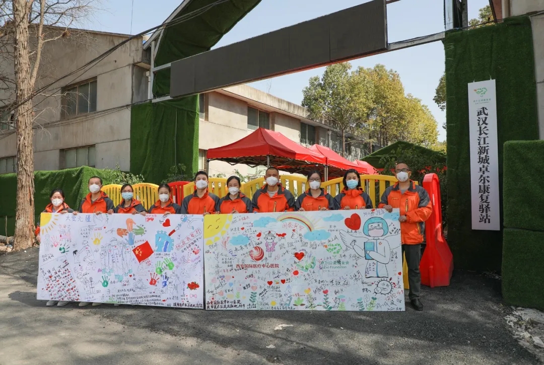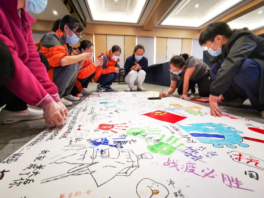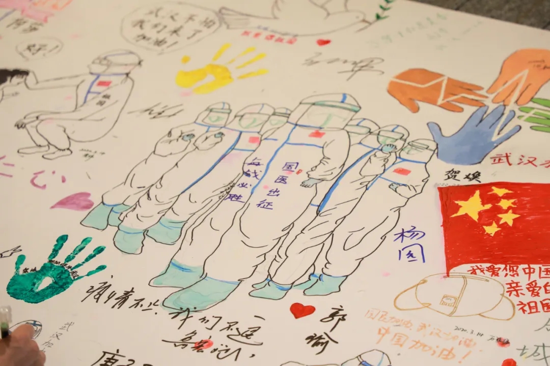 這兩幅畫板由醫(yī)療隊員和駐地的志愿者共同創(chuàng)作,一支支畫筆繪出全體人員戰(zhàn)“疫”祝福心聲:“武漢加油,中國必勝?!?/span>