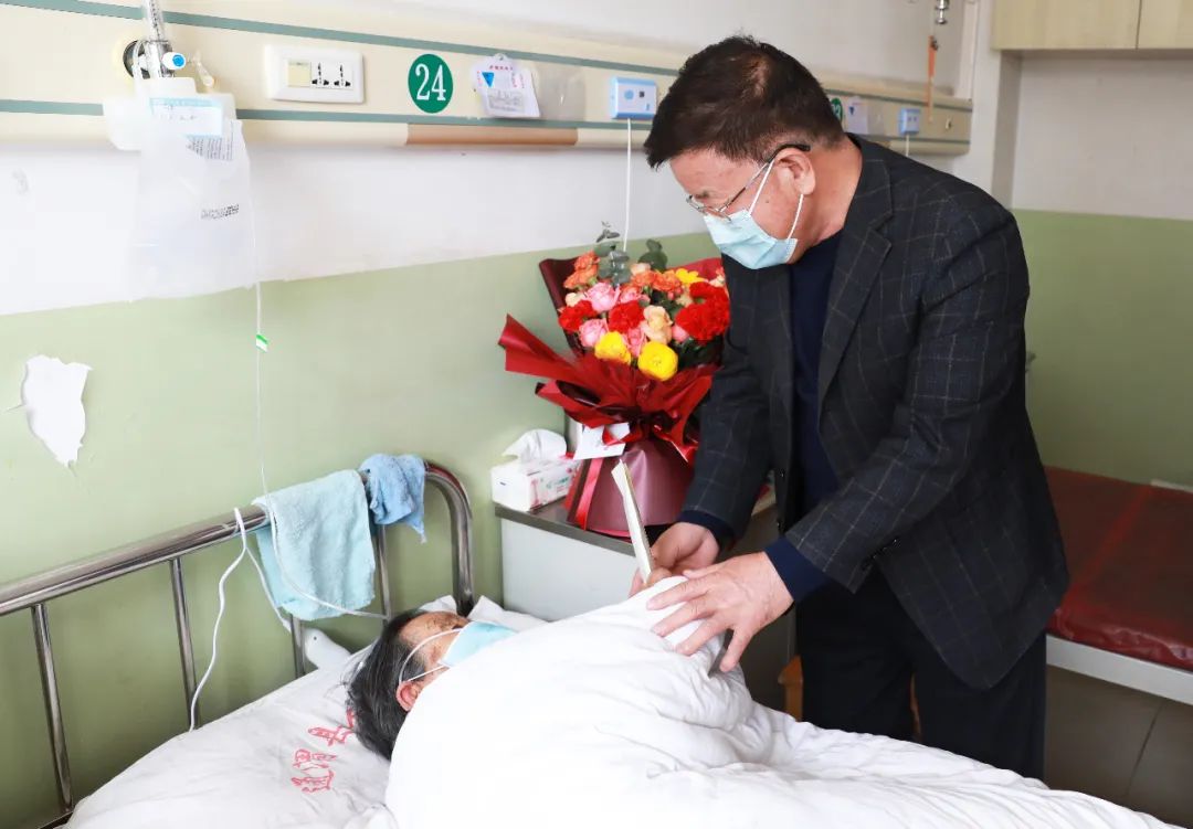 你在前方打仗,我在后方保障!醫(yī)院指派專人與醫(yī)療隊(duì)家屬一一對(duì)接,詳細(xì)了解前方親屬們實(shí)際困難,搭建與隊(duì)員家屬的聯(lián)系平臺(tái),第一時(shí)間了解并解決家屬們的困難。3月18日,王志峰總經(jīng)理、腫瘤醫(yī)院院長(zhǎng)南克俊教授等一行6人,驅(qū)車(chē)300多公里遠(yuǎn)赴甘肅省通渭縣人民醫(yī)院,看望85歲,有著60年黨齡,身患重病的李斌同志母親,為老人送上了慰問(wèn)品及慰問(wèn)金。