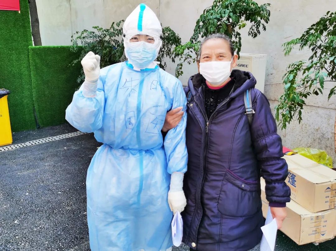 “阿姨你咋還不走呢?”護(hù)士長(zhǎng)朱晴看到一位“熟人 ”還站在驛站門口。這位阿姨的老伴兒感染新冠不幸去世,她和兒子都被傳染,從醫(yī)院到康復(fù)驛站后出現(xiàn)了嚴(yán)重應(yīng)激反應(yīng),失眠,哭泣,休息不好,血壓升高,胃口很差。除了關(guān)注阿姨的身體狀況外,朱晴時(shí)常寬慰她,要保重身體和兒子一起回家?!拔乙湍懔魝€(gè)照片,以后一定要去西安看你。當(dāng)面感謝你們醫(yī)療隊(duì)!”阿姨挽著朱晴的胳膊說。