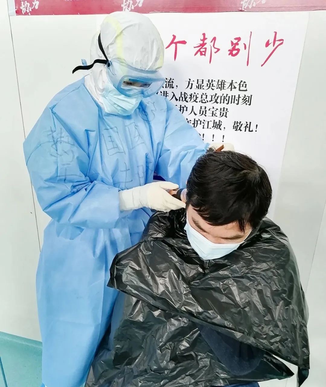 1艙有康復(fù)人員想理發(fā),手頭沒有工具,朱晴護(hù)士長(zhǎng)得知后,聯(lián)系下個(gè)班次護(hù)士帶來推子,給大家理發(fā)?!翱茨銊?dòng)作很嫻熟啊,以前練過的吧”,“圍觀群眾”打趣道?!艾F(xiàn)學(xué)現(xiàn)賣,大家要求不要太高,有壓力?。 敝烨缯f。一直推到推子沒電,朱晴給6位康復(fù)人員簡(jiǎn)單修剪了頭發(fā)。得知朱晴是西安醫(yī)療隊(duì)的護(hù)士,大家都親切的稱她“肉夾饃”!