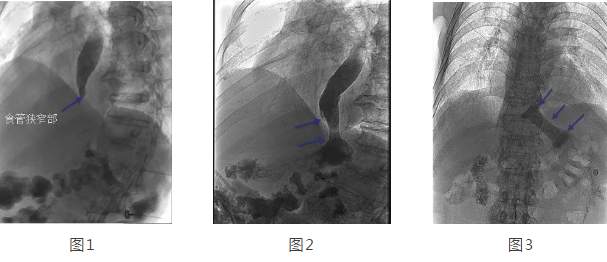 在韓國宏教授的帶領下,專家團隊經(jīng)多方面評估后,決定在DSA下為劉大爺行食管造影 食管支架置入術。術中透視可見食管中上段擴張明顯,食管下端賁門口明顯狹窄,造影劑淤積,呈線性緩慢進入胃腔(見圖1),經(jīng)過準確定位后,釋放食管支架,再次造影可見造影劑經(jīng)支架順利進入胃腔(見圖2)。2天后再次造影見食管支架完全打開,位置正常,造影劑可順利通過支架(見圖3)。