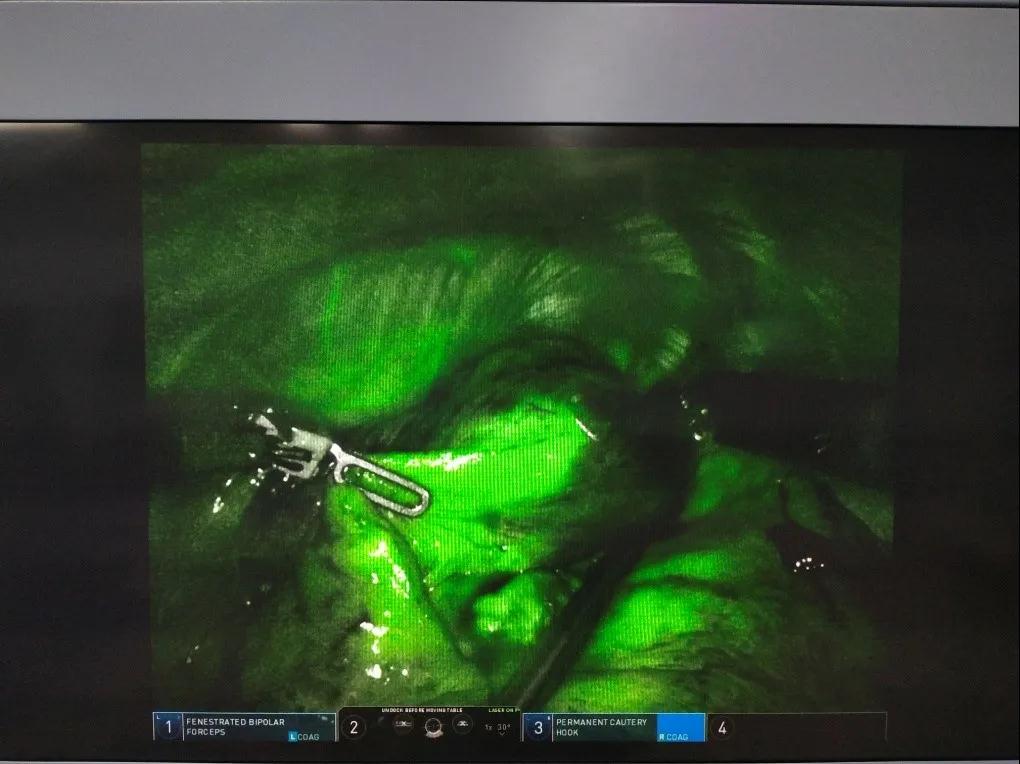 患者是一位老年女性,體檢發(fā)現(xiàn)左肺上葉尖后段結節(jié)半年,大小約1.6cm,近期復查較前明顯增大且實性成分增多。入院經(jīng)全面術前檢查與評估后,接受了第四代達芬奇Xi機器人輔助熒光染色左肺上葉尖后段切除 淋巴結清掃術。主刀醫(yī)師在病人胸部僅用3個0.8厘米的操作孔、1個約3厘米左右的輔助操作口,在胸腔置入機器人機械臂及3D胸腔鏡,將胸腔內的組織結構放大10-15倍。