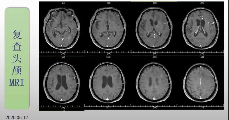 70歲的郝女士去年曾在外院查出“左額島葉”膠質(zhì)母細(xì)胞瘤(WHO Ⅳ級(jí)),并做了左側(cè)額島葉占位性病變切除術(shù)。術(shù)后進(jìn)行了同步放化療。由于治療條件有限,郝女士慕名來(lái)到我院就診。賀世明主任率領(lǐng)醫(yī)護(hù)團(tuán)隊(duì)立即為郝女士進(jìn)行了全面的檢查,決定為其進(jìn)行綜合治療 電場(chǎng)治療。經(jīng)過(guò)三個(gè)多月的綜合治療,患者復(fù)查頭顱MRI病變較前明顯縮小。出院時(shí),郝女士神志清醒,睡眠飲食正常,說(shuō)話很流利。“我是躺著進(jìn)來(lái)的,現(xiàn)在不用人攙扶,自己就可以走出病房了?!焙屡坷t(yī)護(hù)人員的手說(shuō)。