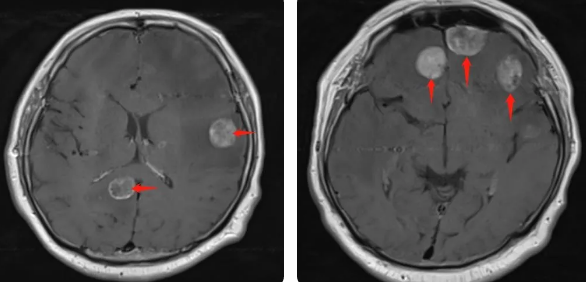 無獨有偶,60歲的左肺癌患者石先生,在外院接受了手術(shù)治療,結(jié)果術(shù)后10月出現(xiàn)腫瘤腦轉(zhuǎn)移,頭部增強MRI顯示:顱內(nèi)多發(fā)占位性病變伴水腫,接二連三的重擊讓石先生出現(xiàn)表情淡漠,沉默寡言,絕食等抑郁癥狀,VMAT放療技術(shù)與心理疏導(dǎo)雙管齊下,3周的治療后顱內(nèi)轉(zhuǎn)移病灶顯著縮小,部分甚至消失,困擾石先生的頭痛、頭暈癥狀也不復(fù)存在,石先生重拾對生活的希望,也對未來的治療充滿信心。