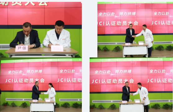 尹強院長與??漆t(yī)院院長、臨床科室、醫(yī)技科室、檢驗中心及機關職能部門主任、代表,簽署了《評審目標責任書》。消化病醫(yī)院執(zhí)行院長韓國宏、腫瘤一病區(qū)黎冬梅護士長分別發(fā)言,一致表示,一定積極參與、配合、支持相關工作,為我院順利通過JCI認證工作全力以赴!