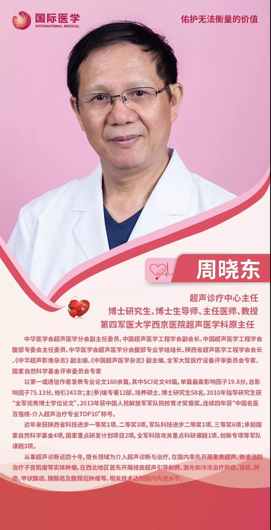 周曉東,中華醫(yī)學(xué)會(huì)超聲醫(yī)學(xué)分會(huì)副主任委員、中國超聲醫(yī)學(xué)工程學(xué)會(huì)副會(huì)長(zhǎng)、陜西省超聲醫(yī)學(xué)工程學(xué)會(huì)會(huì)長(zhǎng)、第四軍醫(yī)大學(xué)西京醫(yī)院超聲醫(yī)學(xué)科原主任、現(xiàn)任西安國際醫(yī)學(xué)中心醫(yī)院超聲診療中心主任。
