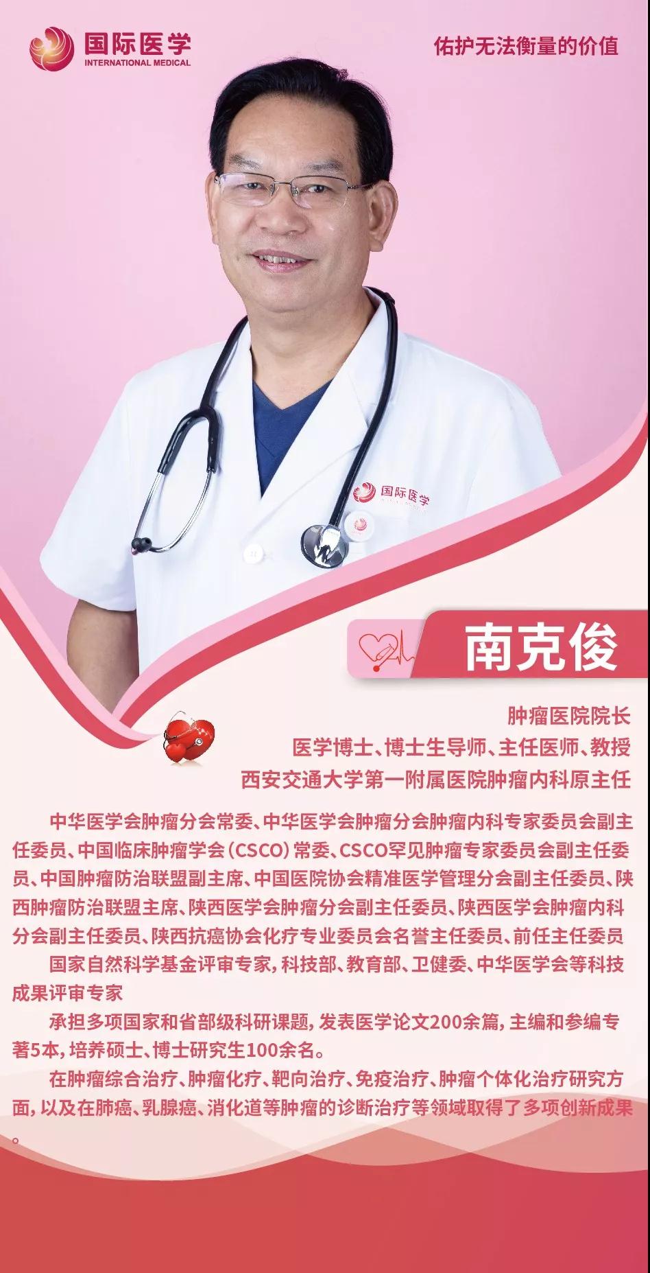 南克俊,腫瘤醫(yī)院院長(zhǎng),醫(yī)學(xué)博士、博士生導(dǎo)師、主任醫(yī)師、二級(jí)教授,西安交通大學(xué)第一附屬醫(yī)院腫瘤內(nèi)科原主任,中華醫(yī)學(xué)會(huì)腫瘤分會(huì)常委,中華醫(yī)學(xué)會(huì)腫瘤分會(huì)腫瘤內(nèi)科專(zhuān)家委員會(huì)副主任委員,中國(guó)臨床腫瘤學(xué)會(huì)(CSCO)常委,CSCO罕見(jiàn)腫瘤專(zhuān)家委員會(huì)副主任委員,中國(guó)腫瘤防治聯(lián)盟副主席,中國(guó)醫(yī)院協(xié)會(huì)精準(zhǔn)醫(yī)學(xué)管理分會(huì)副主任委員,陜西腫瘤防治聯(lián)盟主席,陜西醫(yī)學(xué)會(huì)腫瘤分會(huì)副主任委員;承擔(dān)多項(xiàng)國(guó)家和省部級(jí)科研課題,發(fā)表醫(yī)學(xué)論文200余篇,主編和參編專(zhuān)著5本,培養(yǎng)碩士、博士研究生100余名;在腫瘤綜合治療、腫瘤化療、靶向治療、免疫治療、腫瘤個(gè)體化治療研究方面,以及在肺癌、乳腺癌、消化道等腫瘤的診斷治療等領(lǐng)域取得了多項(xiàng)創(chuàng)新成果。