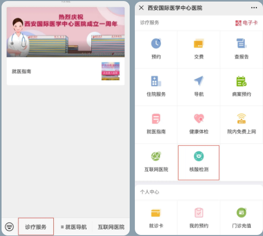 有需要住院、陪護的應(yīng)檢盡檢或愿檢盡檢人群,可關(guān)注“西安國際醫(yī)學(xué)中心醫(yī)院服務(wù)號”后,在【診療服務(wù)】——【核酸檢測】功能中自助開單,支付后前往西安國際醫(yī)學(xué)中心醫(yī)院急診門口預(yù)檢分診點北側(cè)核酸檢測室完成采樣檢測。檢測結(jié)果可在西安國際醫(yī)學(xué)中心醫(yī)院服務(wù)號——【診療服務(wù)】——【查報告】中查看,也可在“西安市民一碼通”——【核酸結(jié)果查詢】中查看。