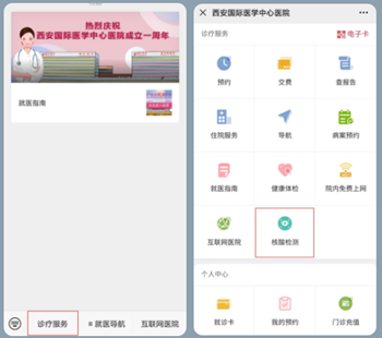 為方便患者進(jìn)行核酸檢查,我院開通核酸檢測(cè)網(wǎng)上預(yù)約,并免掛號(hào)費(fèi)用,患者可通過(guò)西安國(guó)際醫(yī)學(xué)中心醫(yī)院服務(wù)號(hào)進(jìn)行預(yù)約和自助繳費(fèi)。