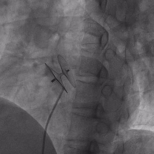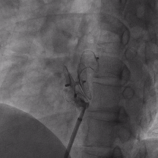 在獲得患者同意后,1月12日,尚福軍主任為患者進行了PFO封堵術(shù)。術(shù)中造影可見封堵器殘余漏,尚福軍主任用精湛的技藝,順利通過封堵器殘余漏裂縫,將右心導管從右房送入左房,且順利到達肺靜脈;遂行卵圓孔未閉封堵術(shù)后殘余漏再次封堵;且完美釋放PFO封堵器,可見兩封堵器呈“馬蹄蓮”狀,再次術(shù)中造影未見殘余漏。