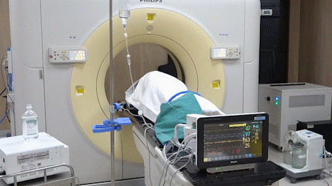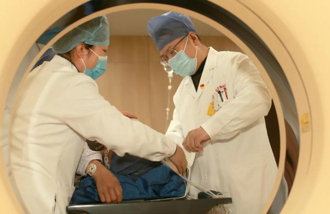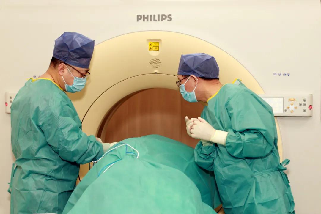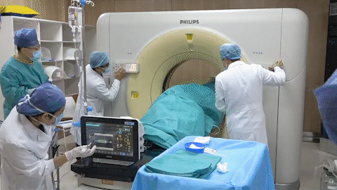 經(jīng)過放射治療中心陸軍主任的細(xì)致準(zhǔn)備與精準(zhǔn)定位,屈女士的射頻治療開始了?;颊卟扇∽髠?cè)臥位,麻醉醫(yī)生立即進(jìn)行靜脈全麻。在CT引導(dǎo)下,醫(yī)生手中的“消融針”,按照既定路線“穿引”,快速、準(zhǔn)確地插入右肺病灶部位,啟動射頻機(jī)器進(jìn)行了精準(zhǔn)的消融,右肺局部癌細(xì)胞一下子就被超高溫成功滅活了!經(jīng)CT掃查,無血?dú)庑?;患者生命體征平穩(wěn)。2個小時后,屈女士就下地活動了。