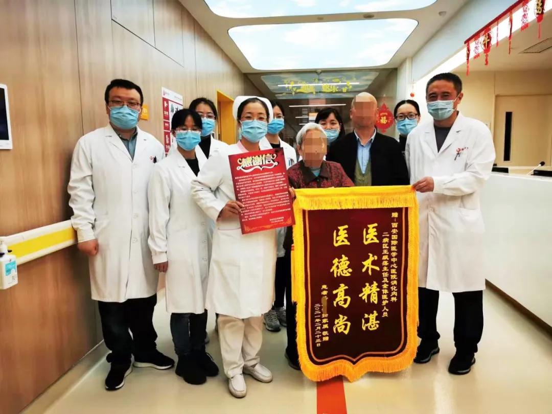 “醫(yī)生與護士們每天都早早到病房看望老人,耐心仔細詢問病情,安撫老人情緒……我代表家人對全體醫(yī)護人員表示最衷心的感謝!”出院當天,岳奶奶的兒女將感謝信與錦旗送到消化內科二病區(qū)醫(yī)護人員手中。