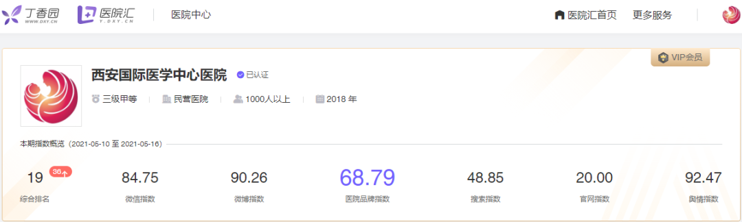 近日,丁香園醫(yī)院匯全國醫(yī)院品牌指數(shù)(5月10日—5月16日)周排行榜發(fā)布,西安國際醫(yī)學(xué)中心醫(yī)院進入全國醫(yī)院品牌指數(shù)綜合排名前20強,位列第19名。
