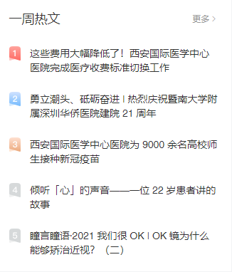 西安國際醫(yī)學(xué)中心醫(yī)院微信公眾號發(fā)布的《這些費用大幅降低了!西安國際醫(yī)學(xué)中心醫(yī)院完成醫(yī)療收費標(biāo)準(zhǔn)切換工作》《西安國際醫(yī)學(xué)中心醫(yī)院為9000余名高校師生接種新冠疫苗》《傾聽心的聲音——一位22歲患者講的故事》3篇文章入選丁香園丁香號的一周熱文榜單前五名。