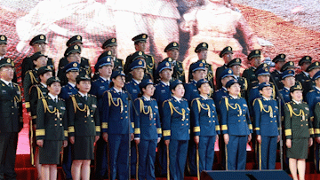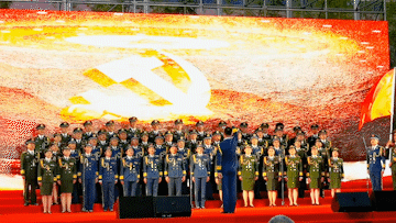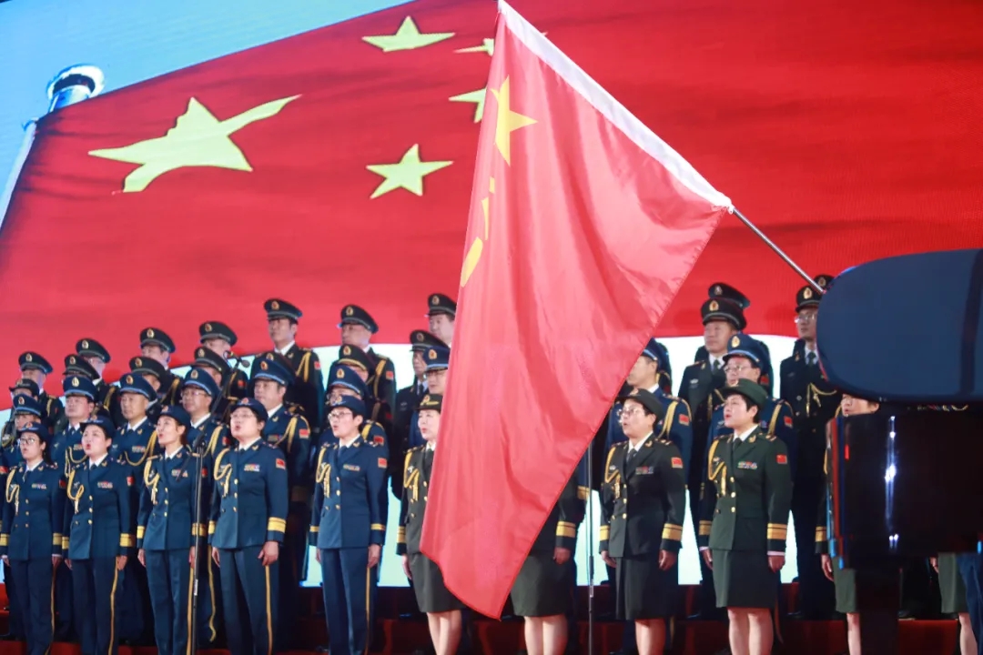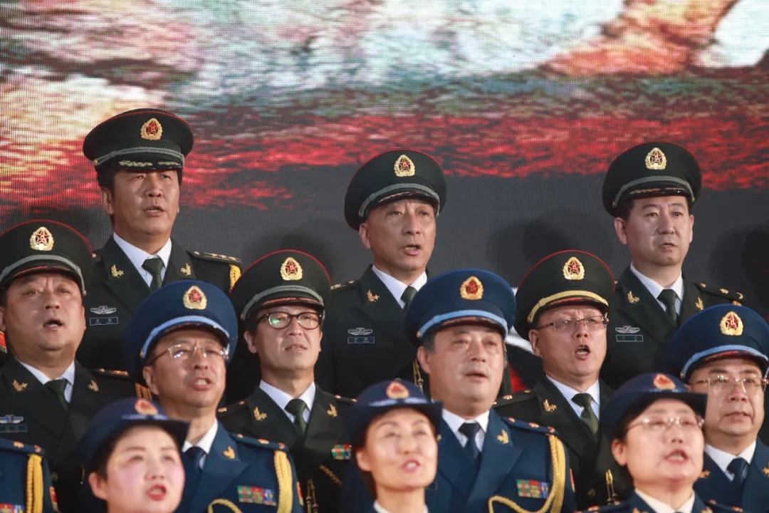 “我是一個(gè)兵,來自老百姓……”合唱將《我是一個(gè)兵》《沒有共產(chǎn)黨就沒有新中國》巧妙編排在一起?!段沂且粋€(gè)兵》鏗鏘有力,氣勢高亢,展示了老兵們永不褪色的軍人風(fēng)采;隨著中國人民解放軍進(jìn)行曲響起,三名軍旗手,邁著堅(jiān)實(shí)的步伐走上舞臺;“沒有共產(chǎn)黨就沒有新中國,沒有共產(chǎn)黨就沒有新中國……”激情高昂的歌聲表達(dá)出每一個(gè)人的心聲,合唱融入了京劇唱法,男聲鏗鏘有力,氣勢十足,女聲委婉細(xì)膩,優(yōu)美動聽,極富有感染力,將整場氣氛推向高潮,贏得全場陣陣掌聲。