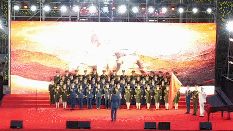 “一二一”,演出開始,由71名退役軍官組成的退役軍人合唱團(tuán),在尹強(qiáng)院長的帶領(lǐng)下,邁著整齊的步伐,喊著響亮的口號,雄赳赳,氣昂昂走上舞臺。