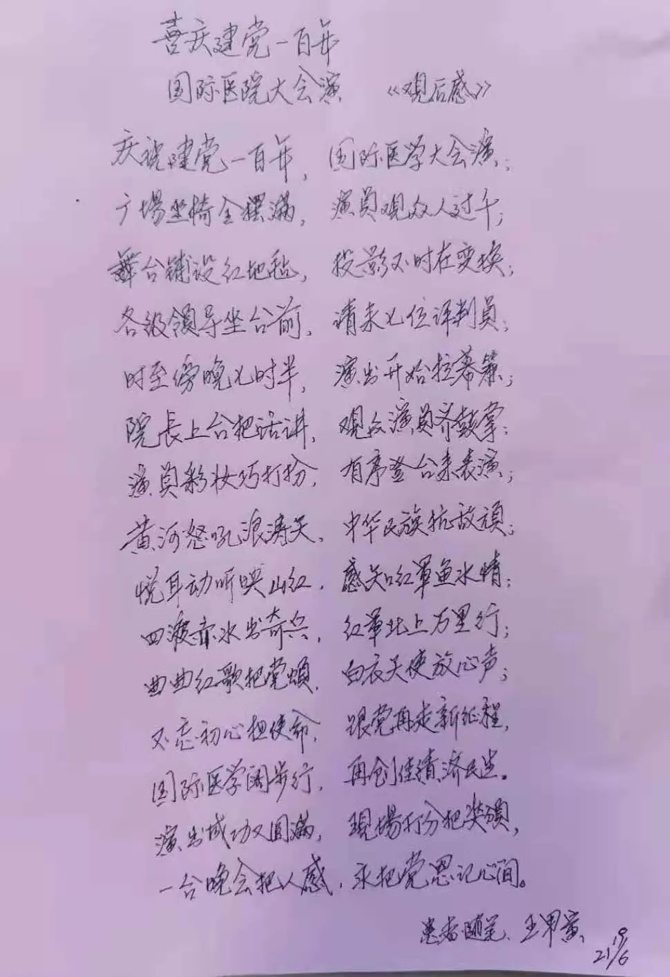 “曲曲紅歌把黨頌,白衣天使放心聲;不忘初心擔(dān)使命,跟黨再走新征程;國際醫(yī)學(xué)闊步行,再創(chuàng)佳績濟(jì)民生……” 一位患者在觀看演出后,深情寫下這首《觀后感》,為西安國際醫(yī)學(xué)中心醫(yī)院點(diǎn)贊。