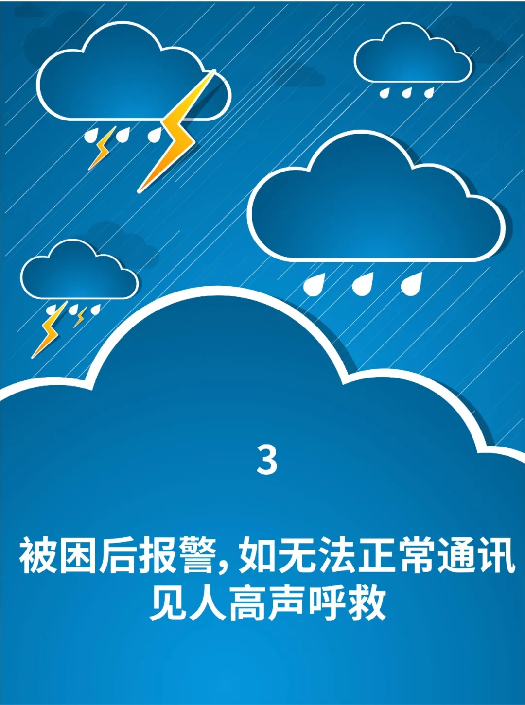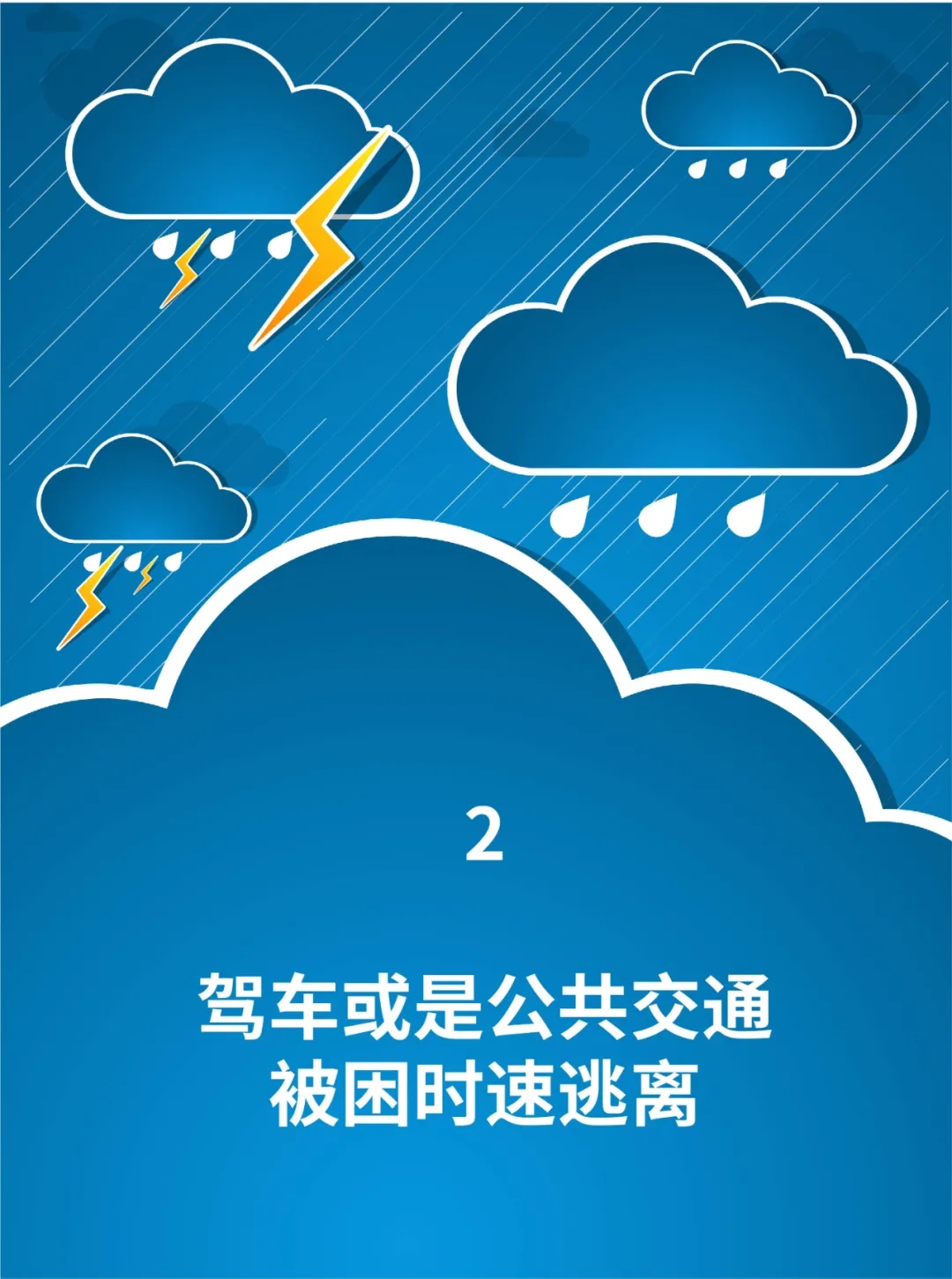 地鐵站、地下停車場(chǎng)、地下通道、下坡、下沉式立交橋下等低洼地段以及有橋梁、有漩渦的地方很危險(xiǎn)。遠(yuǎn)離老舊建筑、電線桿、廣告牌、路燈。遠(yuǎn)離高壓線、高壓電塔、變電器,電閘、配電箱等電力設(shè)施及有供電危險(xiǎn)標(biāo)志的一切物品。