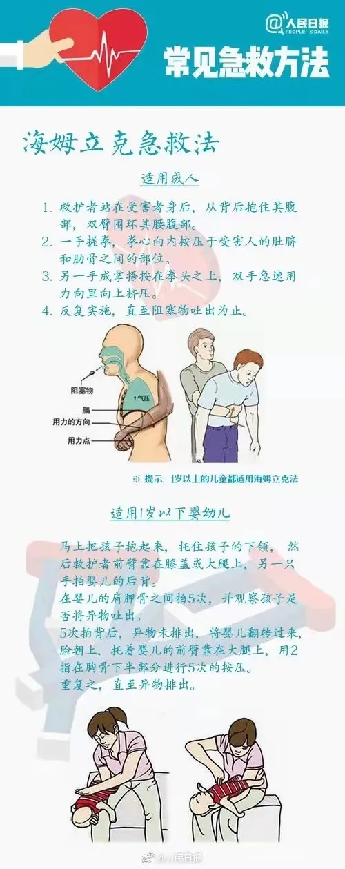 一歲以內(nèi)嬰兒的急救措施:這個時期的嬰兒如果發(fā)生窒息,應先將嬰兒面朝下放置在手臂上,手臂貼著前胸,大拇指和其余四指分別卡在下頜骨位置。另一只手在嬰兒背上肩胛骨中間拍5次。然后觀察異物有沒有被吐出。如果沒有吐出,立刻將嬰兒翻過來,頭沖下腳沖上,面對面放置在大腿上。一手固定在嬰兒頭頸位置,一手伸出食指中指,快速壓迫嬰兒胸廓中間位置,重復五次之后將孩子翻過來重復步驟一。直至將異物排出為止。