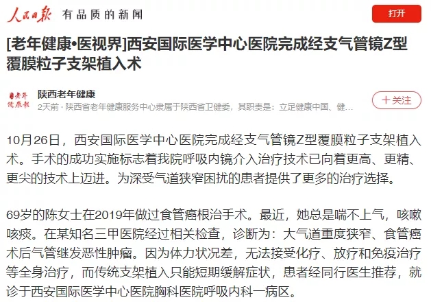 [老年健康?醫(yī)視界]西安國際醫(yī)學(xué)中心醫(yī)院完成經(jīng)支氣管鏡Z型覆膜粒子支架植入術(shù)