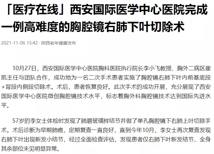 「醫(yī)療在線」西安國際醫(yī)學(xué)中心醫(yī)院完成一例高難度的胸腔鏡右肺下葉切除術(shù)