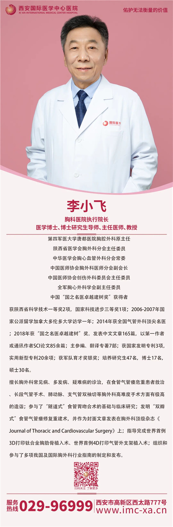 2021年11月,李小飛來到西安國際醫(yī)學(xué)中心醫(yī)院任胸科醫(yī)院執(zhí)行院長(zhǎng)。李小飛兢兢業(yè)業(yè)、忘我工作,只為患者重返健康,感受生命的美好;勇于創(chuàng)新、不辭辛勞,只為攻克醫(yī)學(xué)難題而前行;醫(yī)者仁心、大志于胸,為更多的患者保駕護(hù)航,為他們帶來重生和希望。
