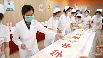 醫(yī)護餐廳為護理兄弟姐妹們精心準備了60*400cm的蛋糕?!白4蠹夜?jié)日快樂!”李武平副院長、張敏主任及各科室護士長共同切蛋糕送祝福。