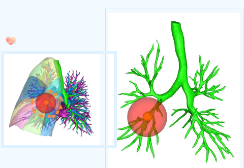 據(jù)王武平主任介紹,胸外科團隊目前已常規(guī)開展不同部位肺小結(jié)節(jié)的聯(lián)合肺亞段切除術(shù),為肺小結(jié)節(jié)患者提供個體化的治療。術(shù)前進行三維重建,以磨玻璃結(jié)節(jié)為中心,勾勒出病灶周圍2cm切緣球,規(guī)劃切除范圍和路徑,保證足夠切緣,實現(xiàn)肺結(jié)節(jié)的精準切除和患者快速康復(fù),該技術(shù)既能實現(xiàn)肺結(jié)節(jié)的切除治愈,又能最大程度保留患者的肺功能,是目前針對早期肺磨玻璃結(jié)節(jié)肺癌較先進的外科診療技術(shù)。