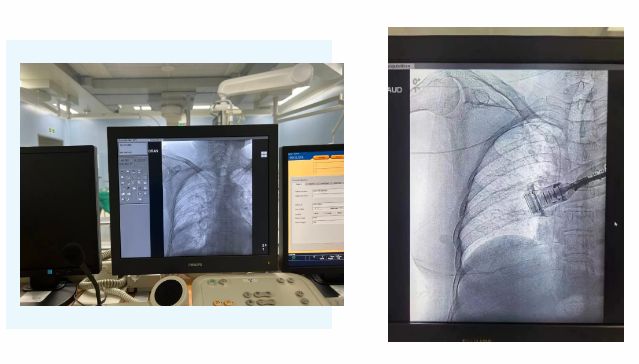 在麻醉手術(shù)中心的配合下,手術(shù)首先由韓海靜護(hù)士長在超聲引導(dǎo)下應(yīng)用“塞丁格”法穿刺將針尖一樣細(xì)的導(dǎo)絲送入血管,術(shù)中在DSA透視下將導(dǎo)管沿著血管送達(dá)上腔靜脈,尖端精準(zhǔn)定位至上腔靜脈開口處。隨后,胸腔外科支亞男主治醫(yī)師在穿刺點(diǎn)下方取2厘米小切口內(nèi)進(jìn)行上臂港囊袋和隧道的制作及導(dǎo)管與港座連接,最后進(jìn)行港體埋植及皮內(nèi)縫合,使患者切口隱蔽美觀創(chuàng)傷小,術(shù)中出血量極少。手術(shù)在X片影像留影,最終手術(shù)順利完成。