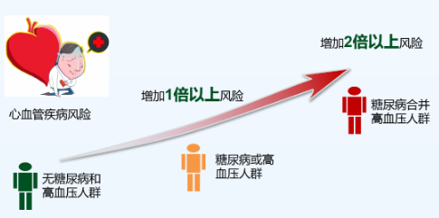 和無糖尿病、高血壓的人群相比,患糖尿病或高血壓能使心血管疾病風(fēng)險(xiǎn)增加1倍以上,同時(shí)患糖尿病和高血壓的患者,心血管疾病風(fēng)險(xiǎn)增加2倍以上。