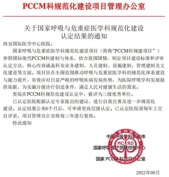 近日,國(guó)家呼吸與危重癥醫(yī)學(xué)科規(guī)范化建設(shè)項(xiàng)目管理辦公室發(fā)布新聞,西安國(guó)際醫(yī)學(xué)中心醫(yī)院獲國(guó)家呼吸與危重癥醫(yī)學(xué)科規(guī)范化建設(shè)三級(jí)醫(yī)院優(yōu)秀單位。據(jù)悉,這是省內(nèi)繼西京醫(yī)院、唐都醫(yī)院、交大一附院、交大二附院后,第五家獲此殊榮的單位,標(biāo)志著該院呼吸與危重癥醫(yī)學(xué)科綜合實(shí)力躋身國(guó)家優(yōu)秀行列。