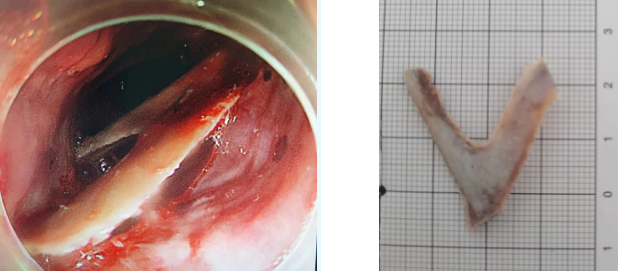 上午11時,在麻醉手術(shù)中心的全力配合下,張惠林醫(yī)生操作內(nèi)鏡,可見異物完全坎頓到食管壁內(nèi),黏膜完全覆蓋異物,經(jīng)多次調(diào)整角度及牽拉方向,用時10分鐘,將骨頭安全取出。從入院后到異物取出用時僅1小時。