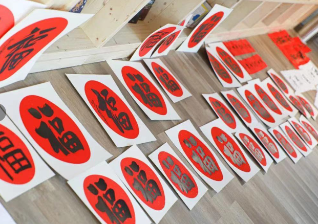 “厚德載物”、“寧?kù)o致遠(yuǎn)”、“天高海闊”......一張張燙金的紅紙散發(fā)著墨香,一個(gè)個(gè)“?!弊衷诳w、行書、草書間自由切換,書法蒼勁有力、磅礴大氣,在紅色的襯托下更顯喜慶祥和。