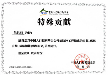 呼吸病藥物研究專委會一直高度重視呼吸慢病防控,鑒于吳昌歸院長對呼吸慢病防控所做的貢獻,中國人口福利基金會授予吳昌歸院長慢病防控工程“特殊貢獻獎”。