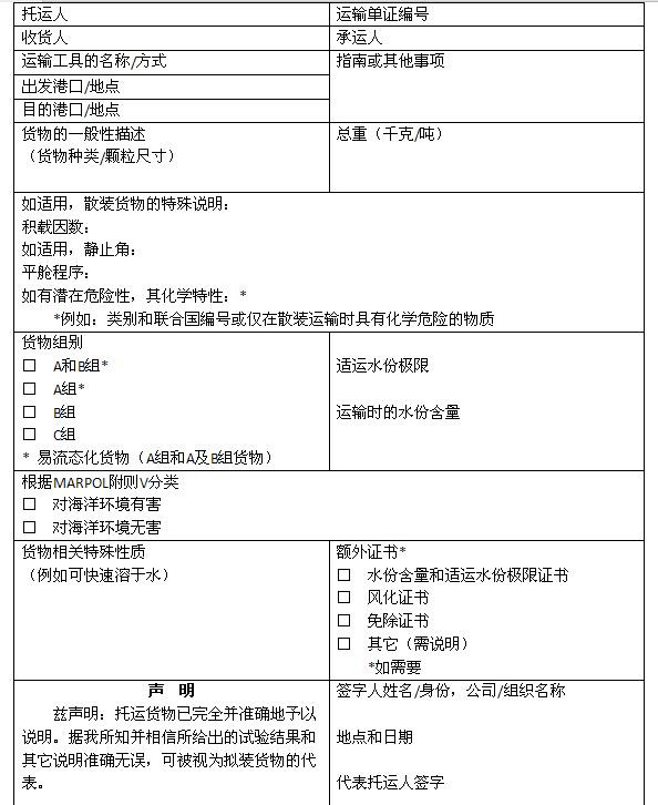 船方應(yīng)當(dāng)要求托運人對其托運的貨物是否對海洋環(huán)境有害進行申明(申明格式見附件2),并將申明隨船保存至少兩年。