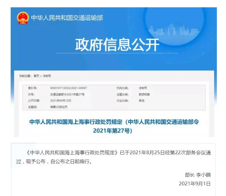 交通運(yùn)輸部發(fā)布《中華人民共和國(guó)海上海事行政處罰規(guī)定》